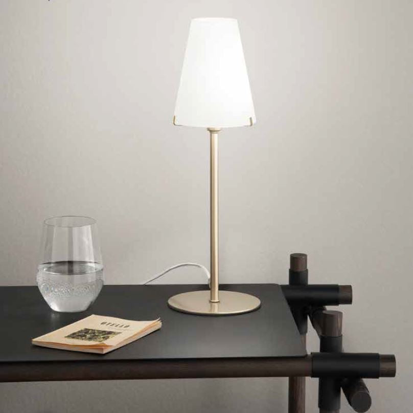 La lampada da tavolo della serie CANTO é realizzata con struttura in metallo finitura oro e diffusore in vetro bianco.