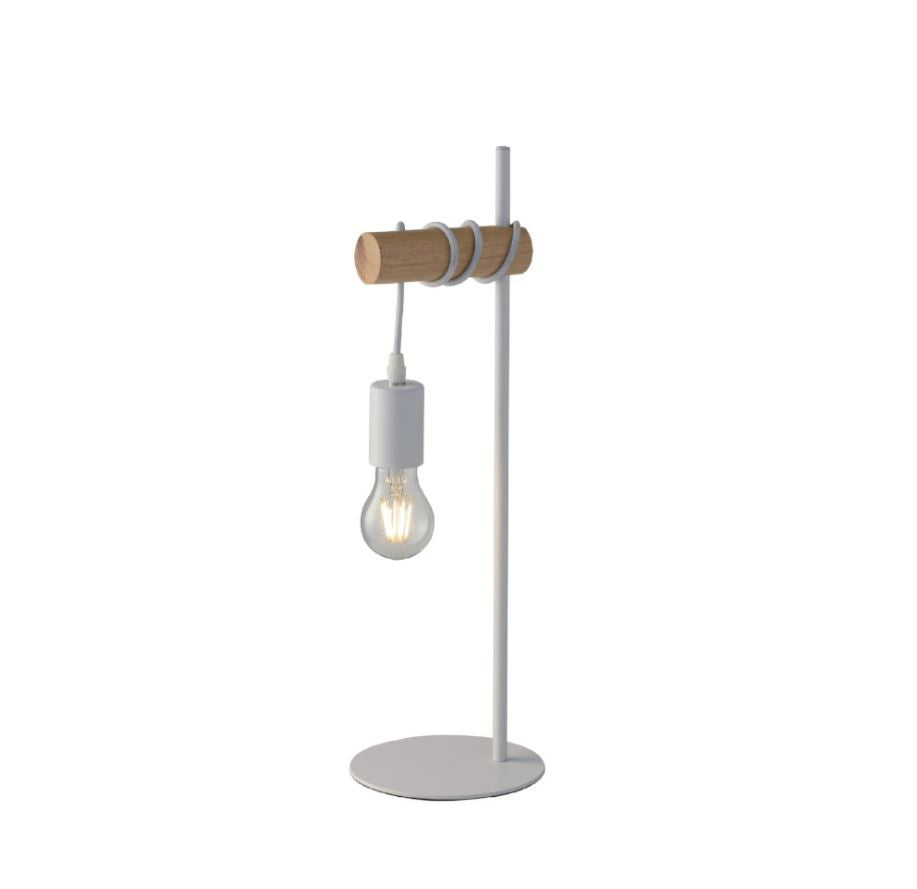 La lampada da tavolo ARIZONA L1 presenta una montatura in metallo bianco matto, composta da un'asta cilindrica in legno colore pino che supporta un portalampada in tinta con la struttura. Il cavo di colore bianco é avvolto sulla struttura stessa ed é possibile quindi regolare l'altezza della luce.
