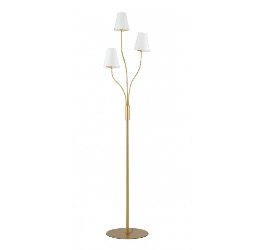 La piantana a 3 luci della serie CANTO é realizzata con struttura in metallo finitura oro e diffusori in vetro bianco.