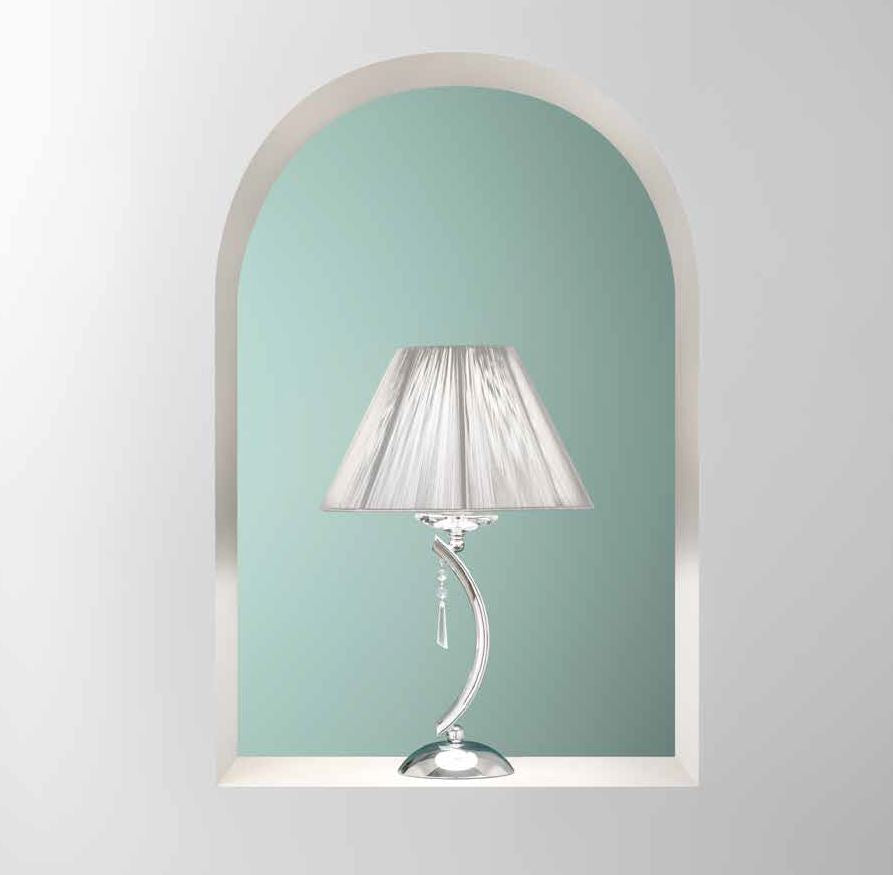 Orchestra di Fan Europe è una collezione di lampade in metallo cromato arricchita da cristalli K9 e paralumi realizzati in tessuto silver.