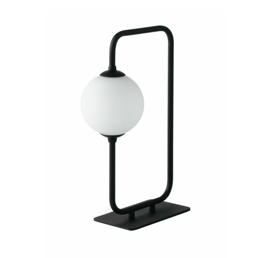 La lampada da tavolo NEUTRON presenta una struttura in metallo finitura nero goffrato con diffusore sferico in vetro bianco satinato.