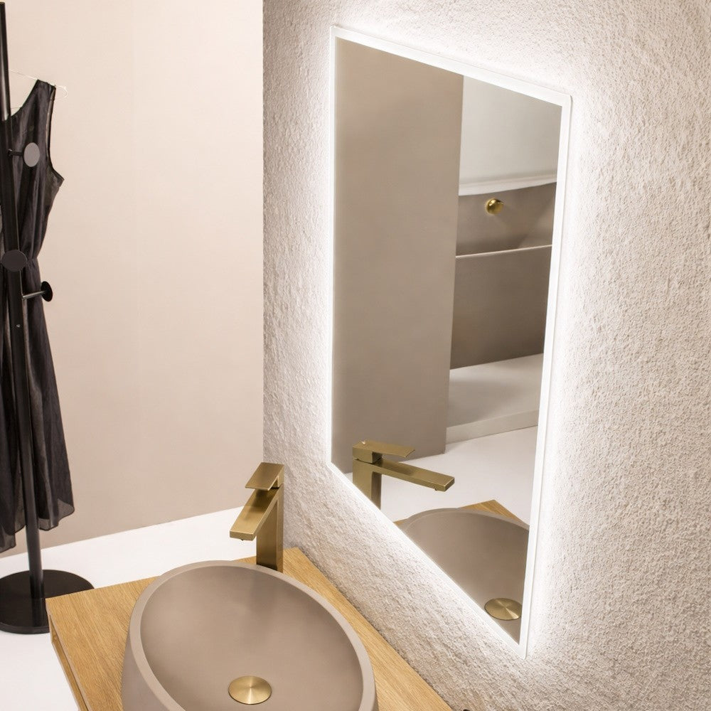 Specchio LED Frame con retroilluminazione integrata e design geometrico pulito, caratterizzato da un elegante bordo satinato illuminato con angoli smussati. Una soluzione ideale per ambienti bagno moderni e spazi contemporanei dove estetica, tecnologia e funzionalità devono convivere in perfetto equilibrio.